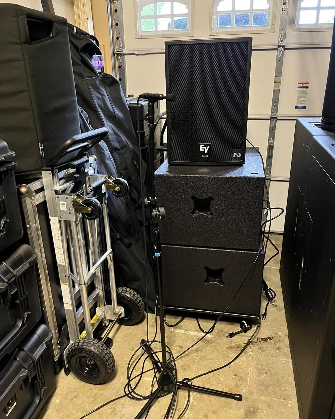 Wedding Reception at Starling Lane Vineyard. Electro-Voice SX250 Speakers with white tripod scrims, 2021